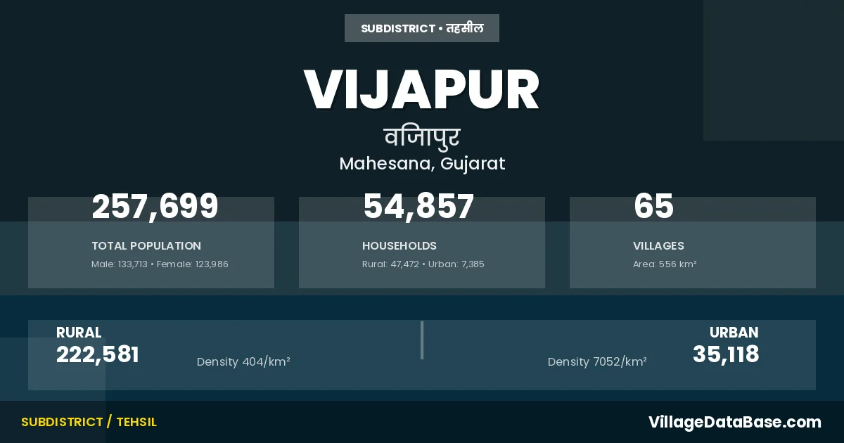 According to the 2011 census The total area of Vijapur Taluka is 556 km², with a population of 257699 people. The population density is 463 inhabitants per square kilometre, and there are approximately 54857 houses in the sub district.