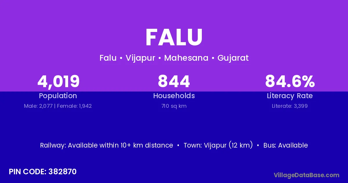 Vijapur (12 km) is the nearest town to Falu village for major economic activities and is located approximately 12 km away.