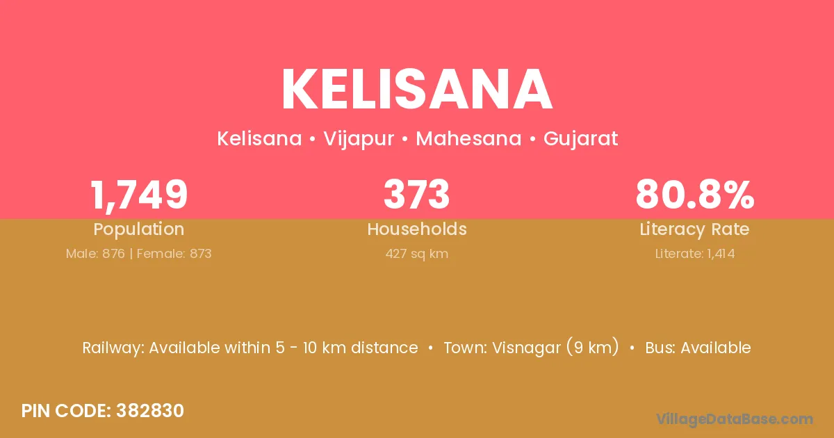 Visnagar (9 km) is the nearest town to Kelisana village for major economic activities and is located approximately 9 km away.
