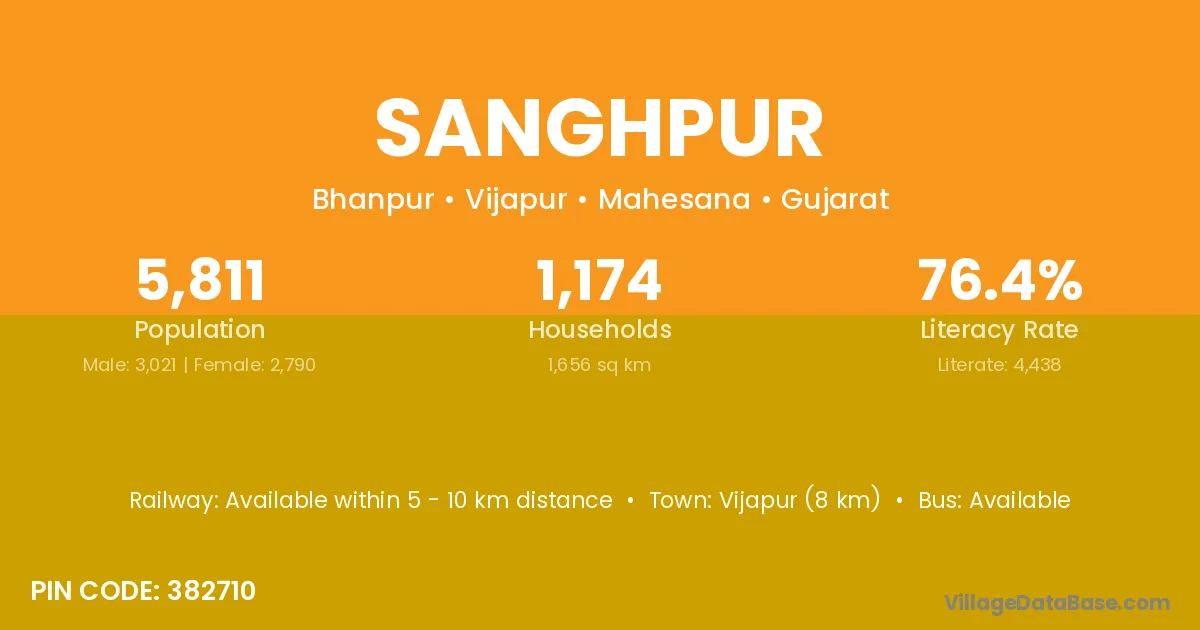Vijapur (8 km) is the nearest town to Sanghpur village for major economic activities and is located approximately 8 km away.