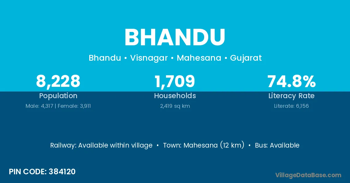 Mahesana (12 km) is the nearest town to Bhandu village for major economic activities and is located approximately 12 km away.