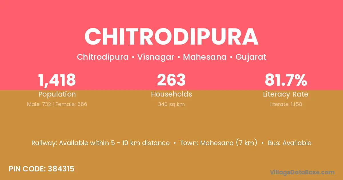 Mahesana (7 km) is the nearest town to Chitrodipura village for major economic activities and is located approximately 7 km away.