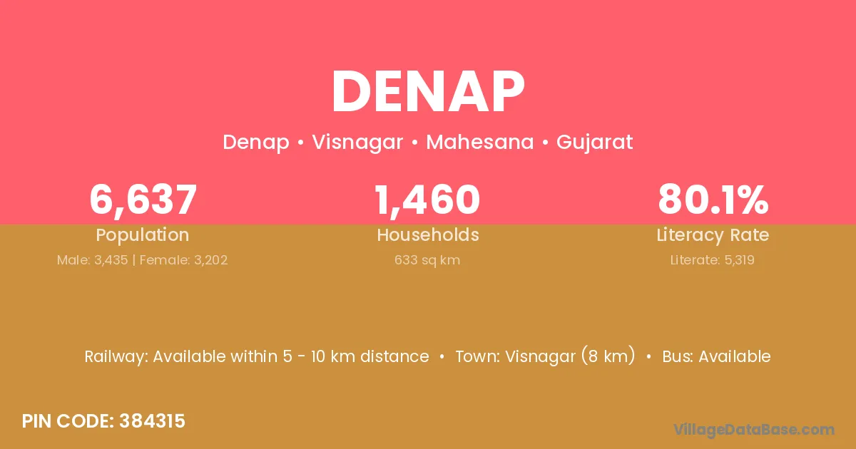 Visnagar (8 km) is the nearest town to Denap village for major economic activities and is located approximately 8 km away.