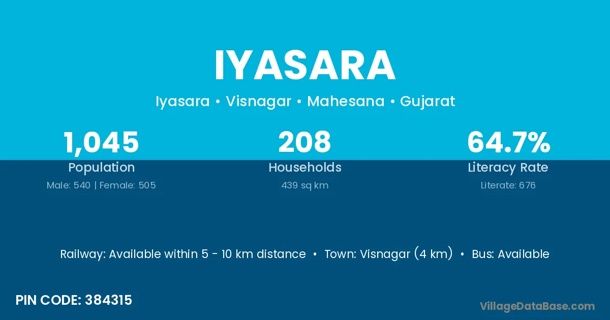 Visnagar (4 km) is the nearest town to Iyasara village for major economic activities and is located approximately 4 km away.