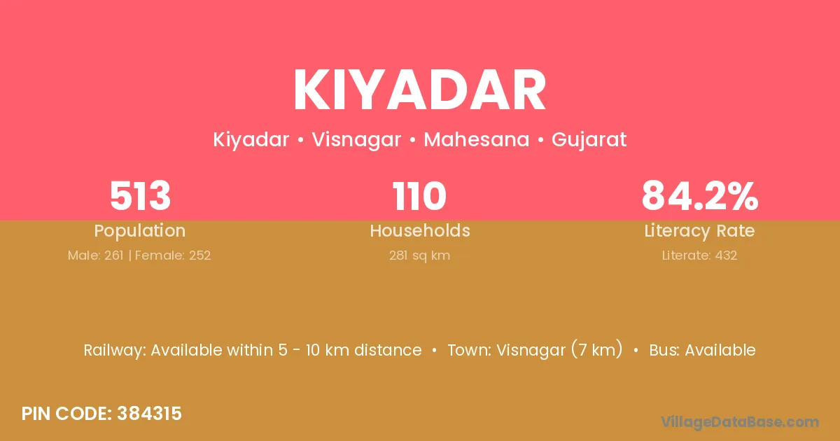 Visnagar (7 km) is the nearest town to Kiyadar village for major economic activities and is located approximately 7 km away.