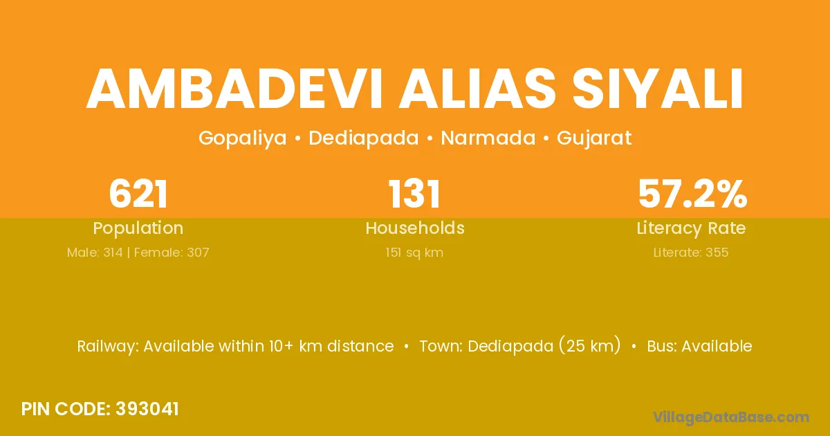Dediapada (25 km) is the nearest town to Ambadevi Alias Siyali village for major economic activities and is located approximately 25 km away.