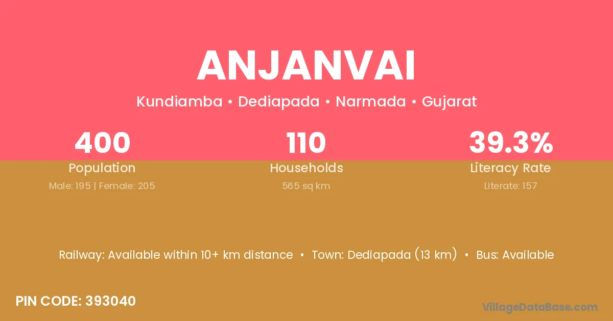 Dediapada (13 km) is the nearest town to Anjanvai village for major economic activities and is located approximately 13 km away.