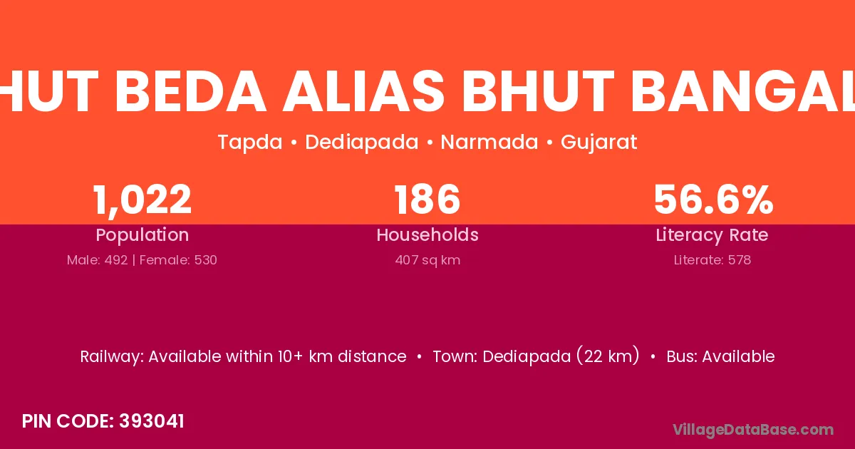 Dediapada (22 km) is the nearest town to Bhut Beda Alias Bhut Bangala village for major economic activities and is located approximately 22 km away.
