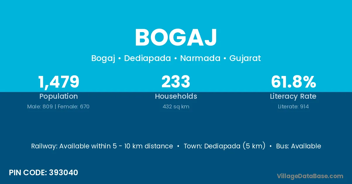 Dediapada (5 km) is the nearest town to Bogaj village for major economic activities and is located approximately 5 km away.