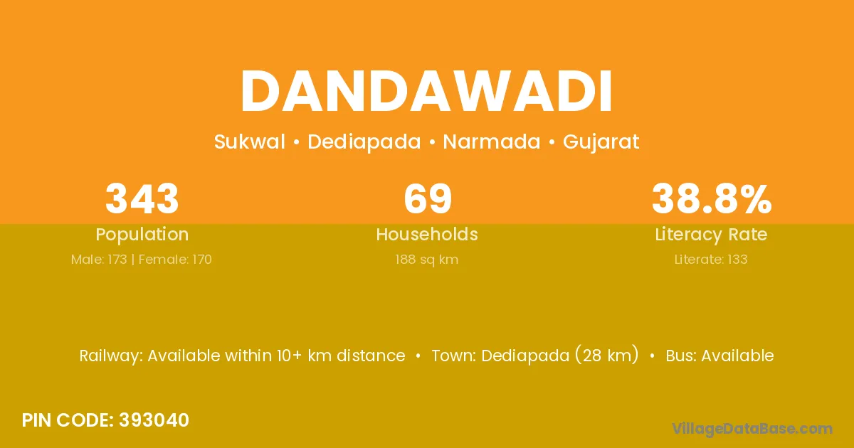 Dediapada (28 km) is the nearest town to Dandawadi village for major economic activities and is located approximately 28 km away.
