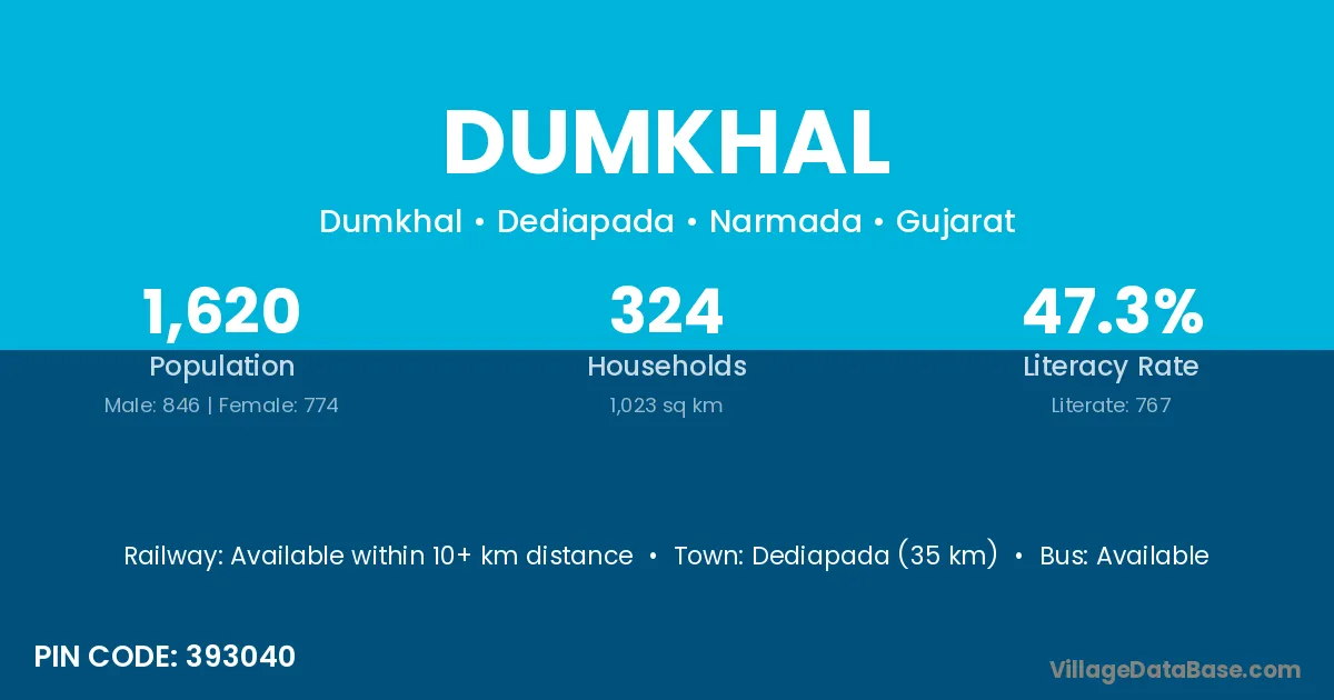 Dediapada (35 km) is the nearest town to Dumkhal village for major economic activities and is located approximately 35 km away.