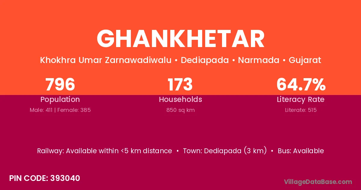Dediapada (3 km) is the nearest town to Ghankhetar village for major economic activities and is located approximately 3 km away.