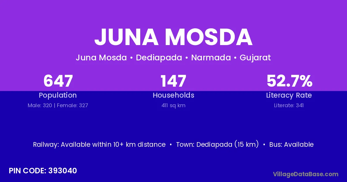 Dediapada (15 km) is the nearest town to Juna Mosda village for major economic activities and is located approximately 15 km away.
