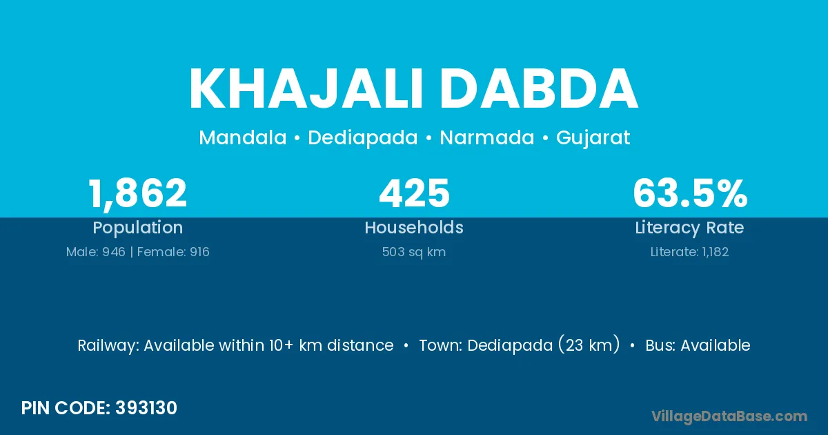 Dediapada (23 km) is the nearest town to Khajali Dabda village for major economic activities and is located approximately 23 km away.