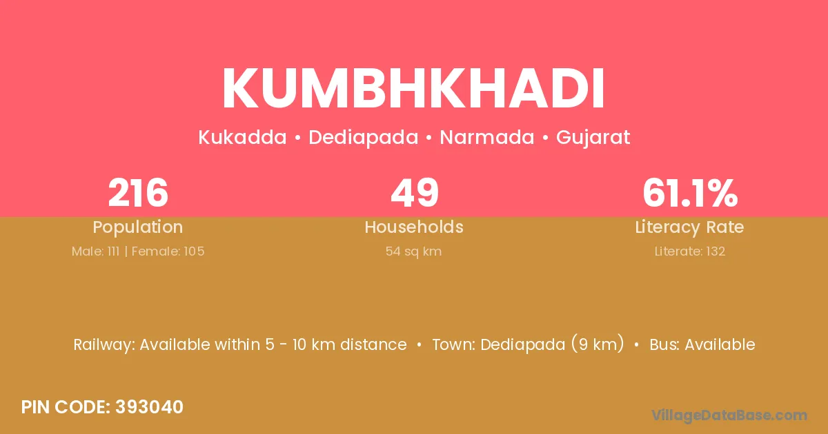 Dediapada (9 km) is the nearest town to Kumbhkhadi village for major economic activities and is located approximately 9 km away.