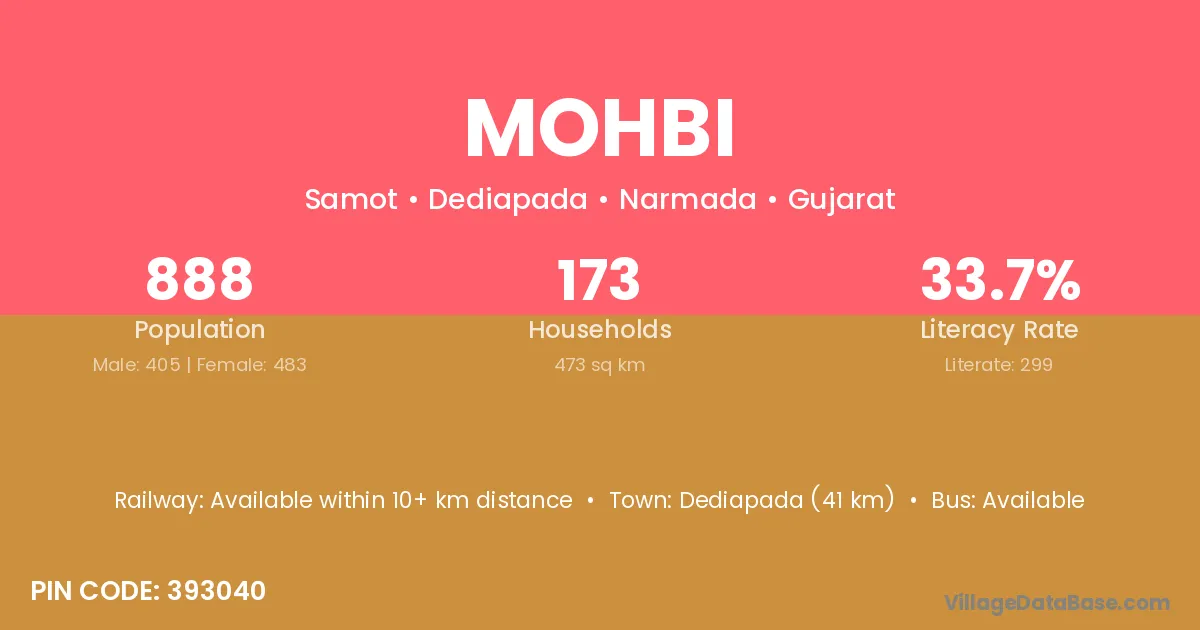 Dediapada (41 km) is the nearest town to Mohbi village for major economic activities and is located approximately 41 km away.