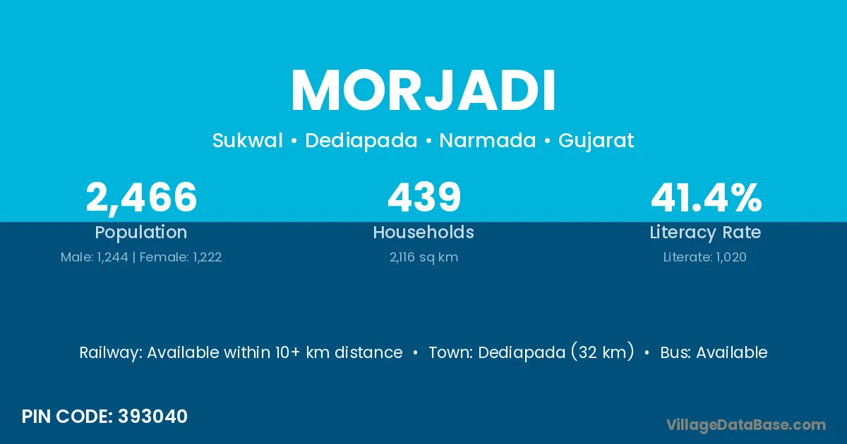 Dediapada (32 km) is the nearest town to Morjadi village for major economic activities and is located approximately 32 km away.