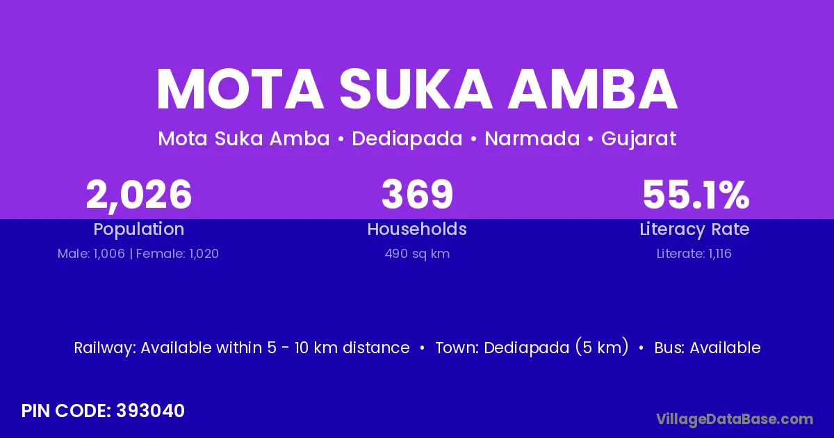 Mota Suka Amba village has a total population of 2,026 people, of which 1,006 are males and 1,020 are females.