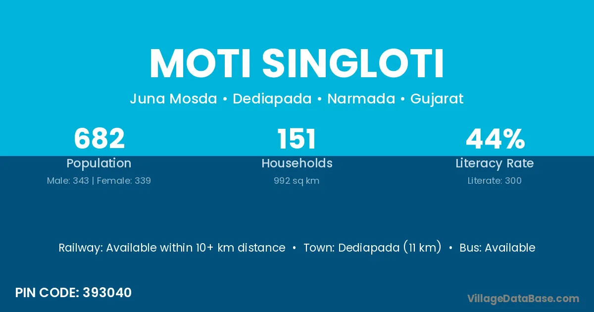 Dediapada (11 km) is the nearest town to Moti Singloti village for major economic activities and is located approximately 11 km away.