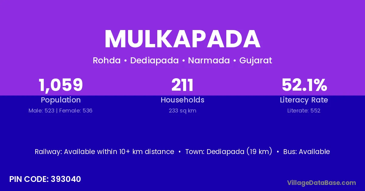 Dediapada (19 km) is the nearest town to Mulkapada village for major economic activities and is located approximately 19 km away.