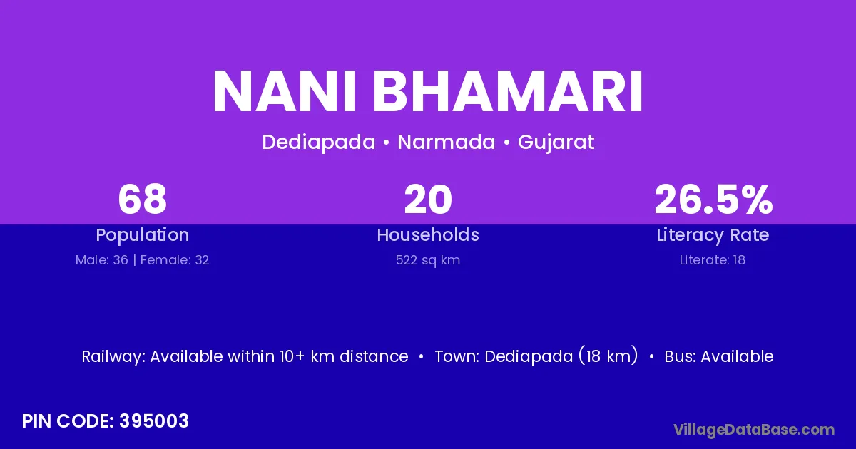 Dediapada (18 km) is the nearest town to Nani Bhamari village for major economic activities and is located approximately 18 km away.