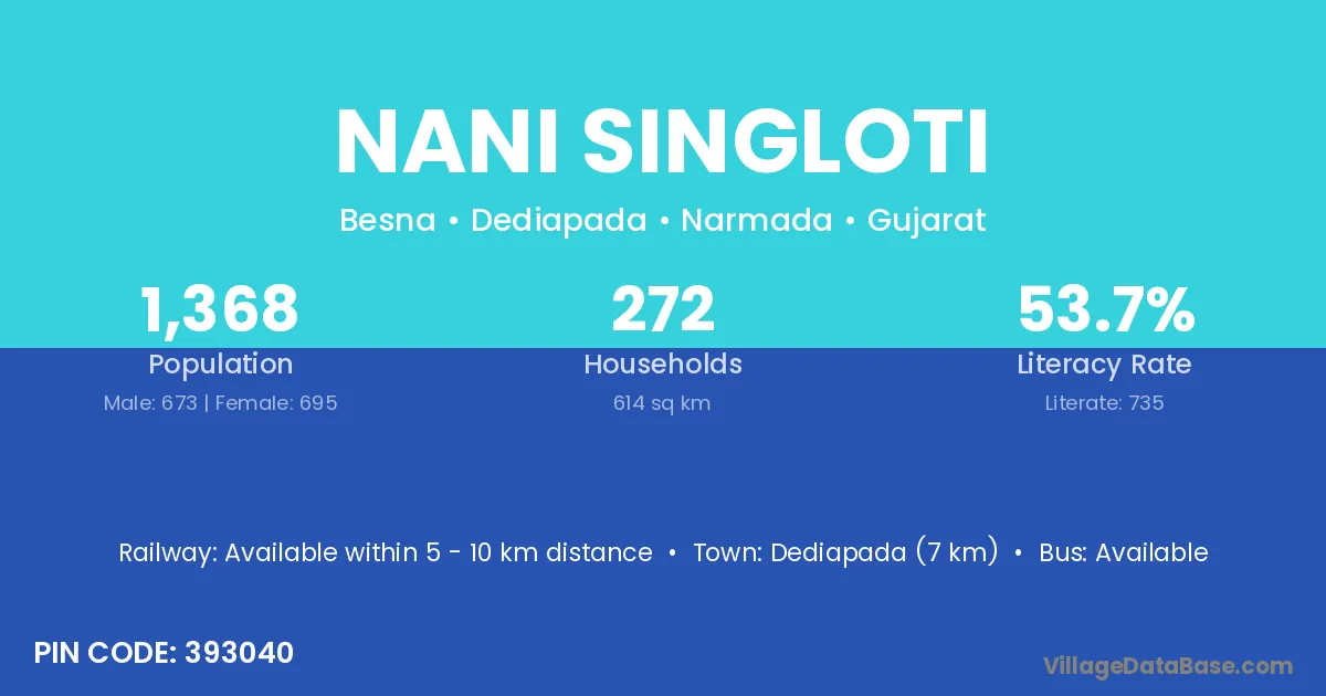 Dediapada (7 km) is the nearest town to Nani Singloti village for major economic activities and is located approximately 7 km away.