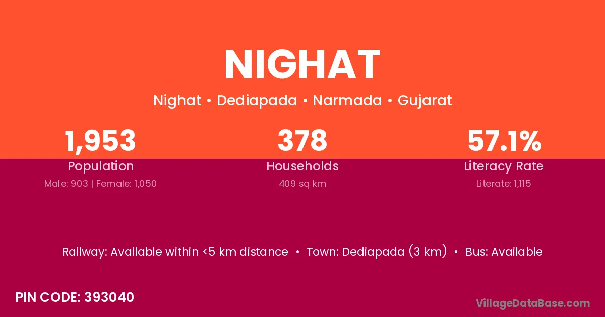 Dediapada (3 km) is the nearest town to Nighat village for major economic activities and is located approximately 3 km away.