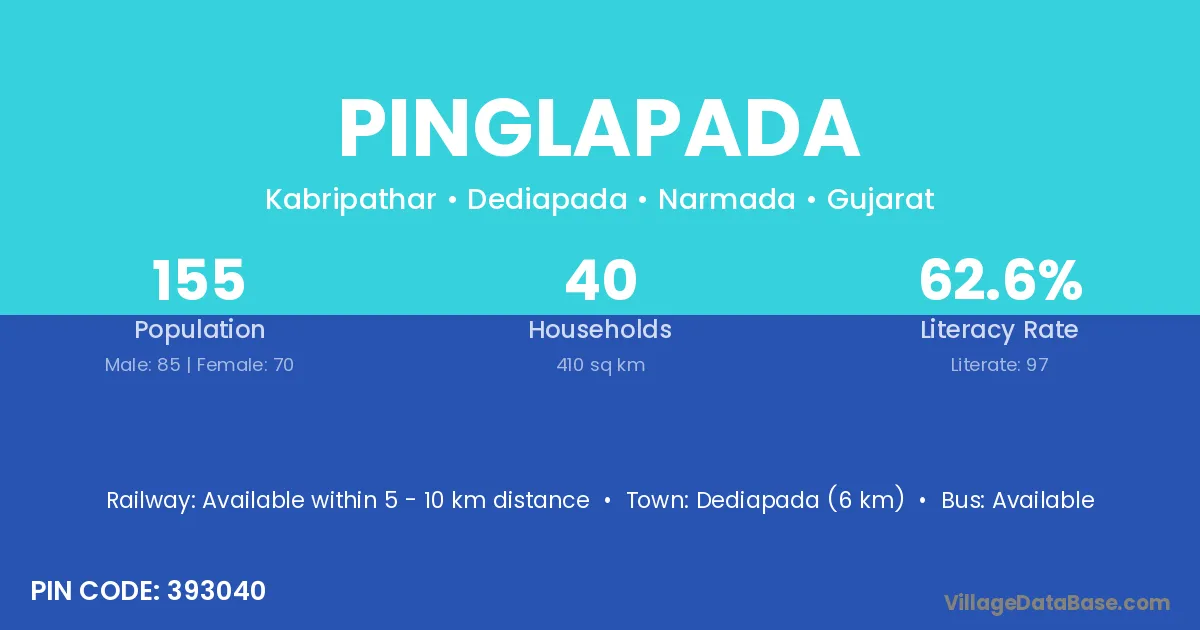 Dediapada (6 km) is the nearest town to Pinglapada village for major economic activities and is located approximately 6 km away.