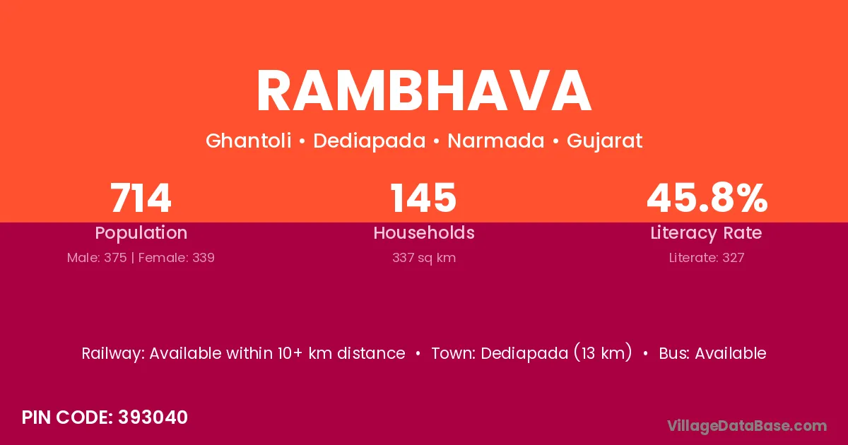 Dediapada (13 km) is the nearest town to Rambhava village for major economic activities and is located approximately 13 km away.