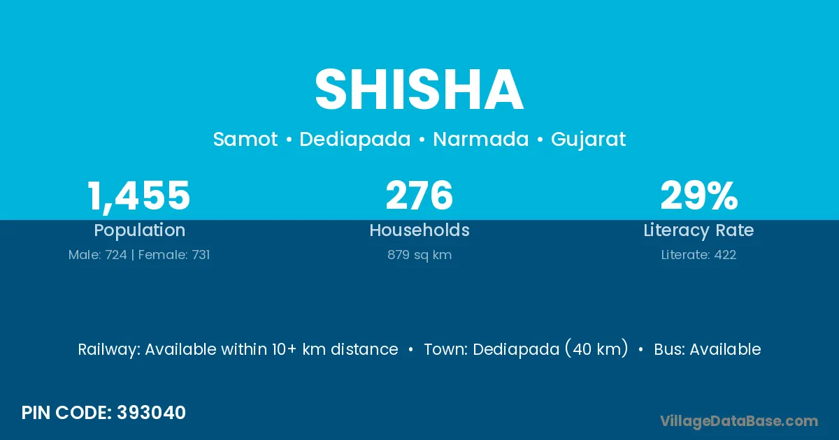 Dediapada (40 km) is the nearest town to Shisha village for major economic activities and is located approximately 40 km away.