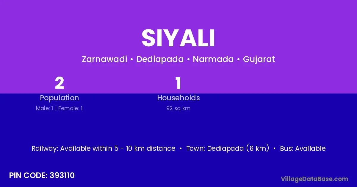 Dediapada (6 km) is the nearest town to Siyali village for major economic activities and is located approximately 6 km away.
