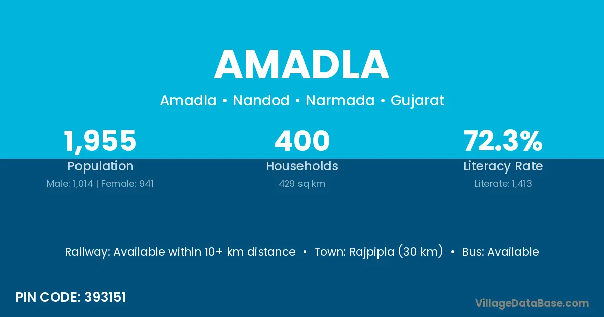 Rajpipla (30 km) is the nearest town to Amadla village for major economic activities and is located approximately 30 km away.
