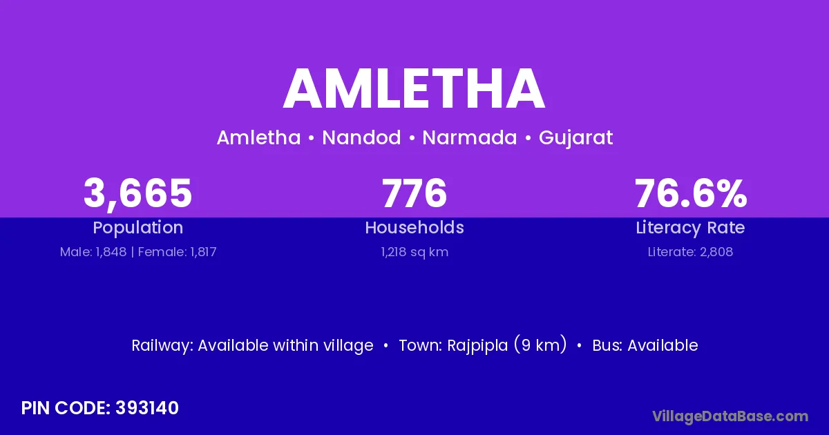 Rajpipla (9 km) is the nearest town to Amletha village for major economic activities and is located approximately 9 km away.