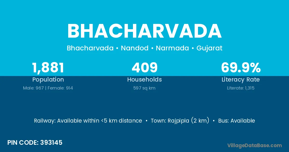 Rajpipla (2 km) is the nearest town to Bhacharvada village for major economic activities and is located approximately 2 km away.