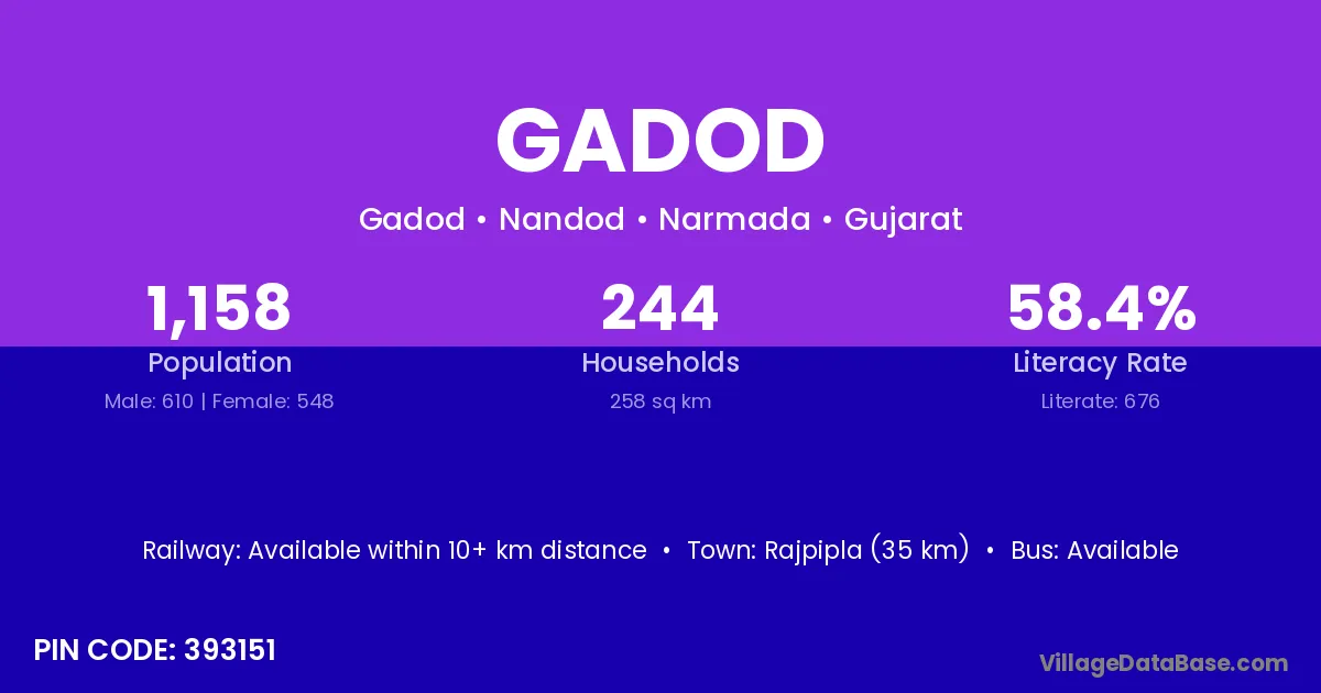 Rajpipla (35 km) is the nearest town to Gadod village for major economic activities and is located approximately 35 km away.