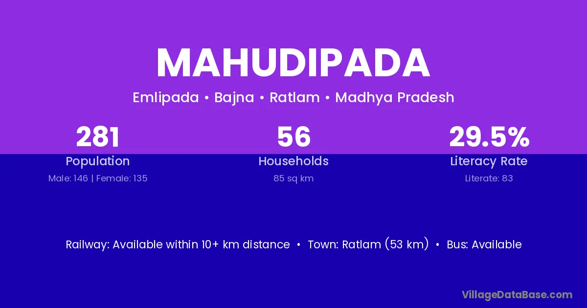 Rajpipla (18 km) is the nearest town to Mahudipada village for major economic activities and is located approximately 18 km away.
