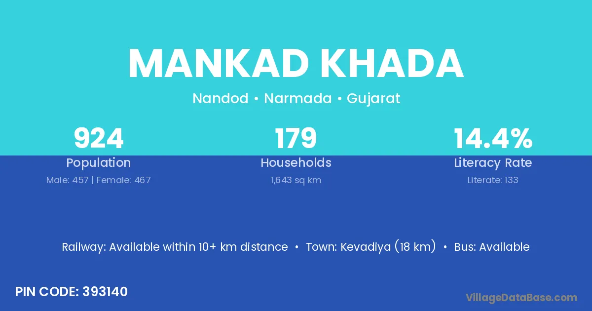 Kevadiya (18 km) is the nearest town to Mankad Khada village for major economic activities and is located approximately 18 km away.