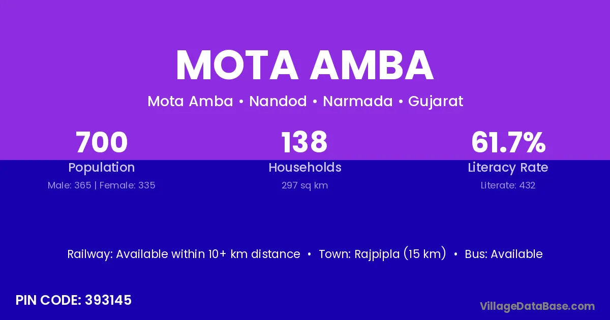 Rajpipla (15 km) is the nearest town to Mota Amba village for major economic activities and is located approximately 15 km away.