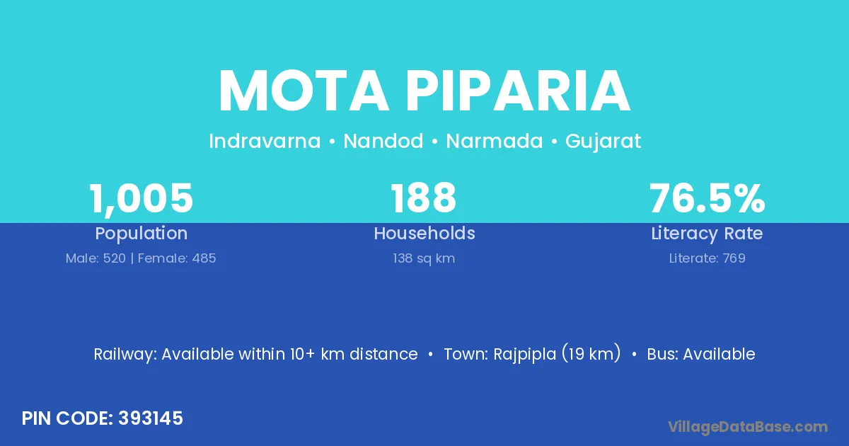 Rajpipla (19 km) is the nearest town to Mota Piparia village for major economic activities and is located approximately 19 km away.
