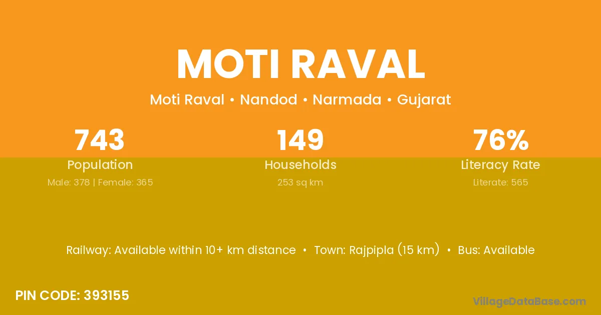 Rajpipla (15 km) is the nearest town to Moti Raval village for major economic activities and is located approximately 15 km away.