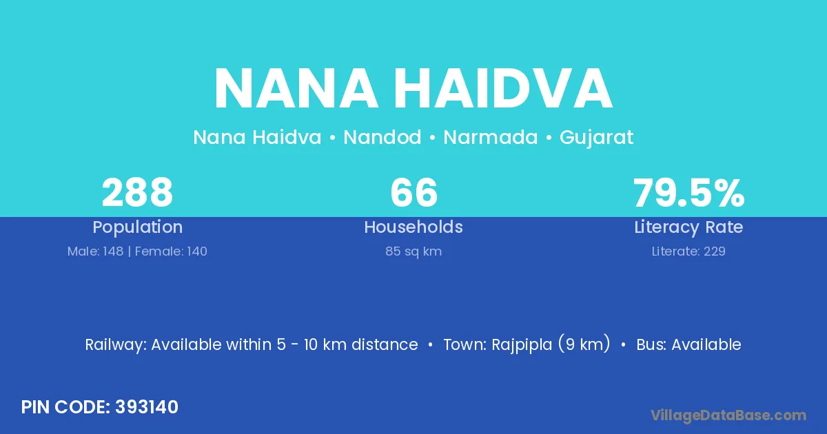 Rajpipla (9 km) is the nearest town to Nana Haidva village for major economic activities and is located approximately 9 km away.