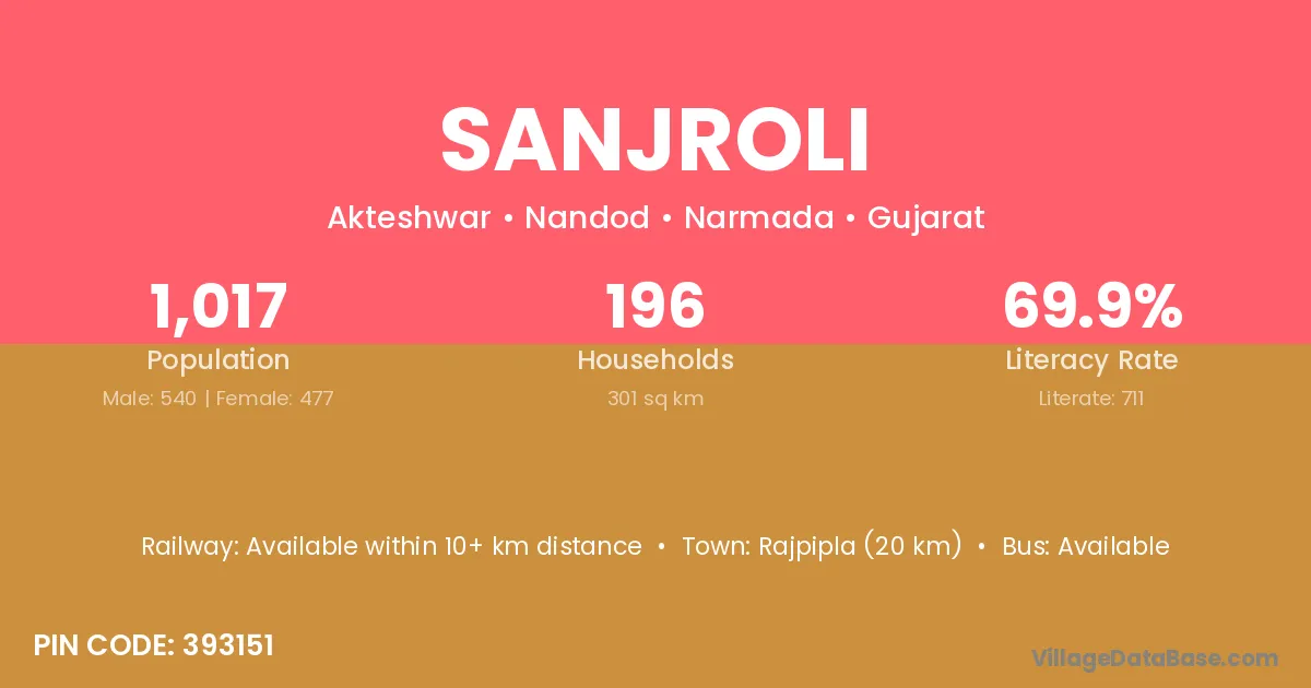 Rajpipla (20 km) is the nearest town to Sanjroli village for major economic activities and is located approximately 20 km away.
