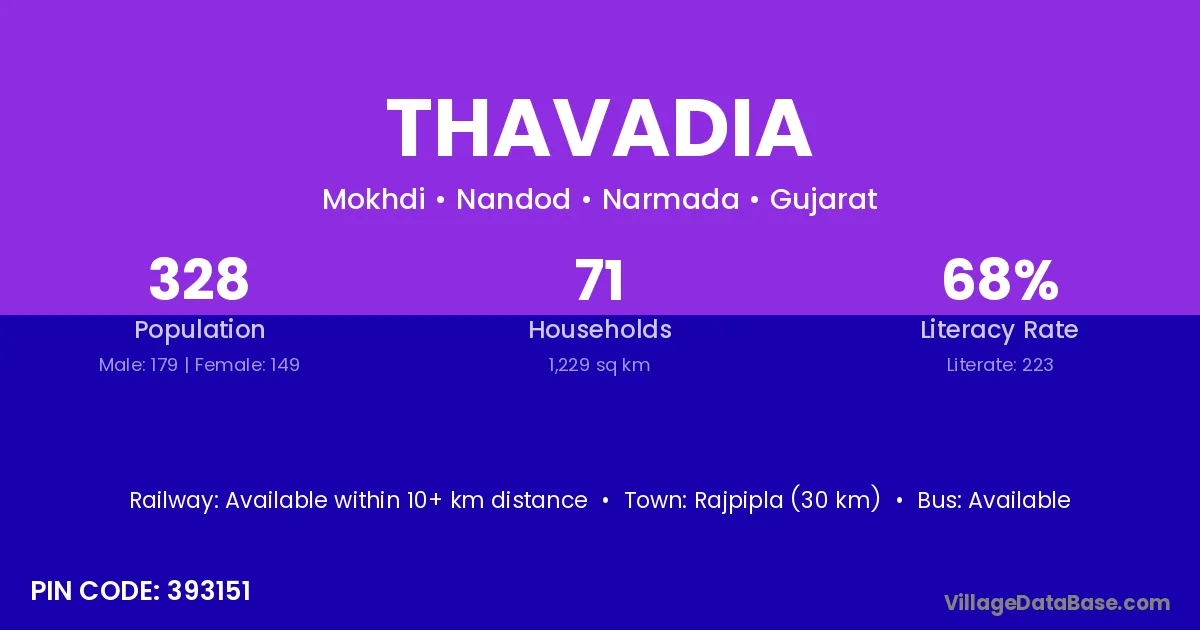 Rajpipla (30 km) is the nearest town to Thavadia village for major economic activities and is located approximately 30 km away.