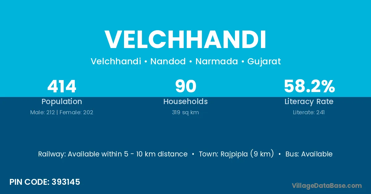 Rajpipla (9 km) is the nearest town to Velchhandi village for major economic activities and is located approximately 9 km away.