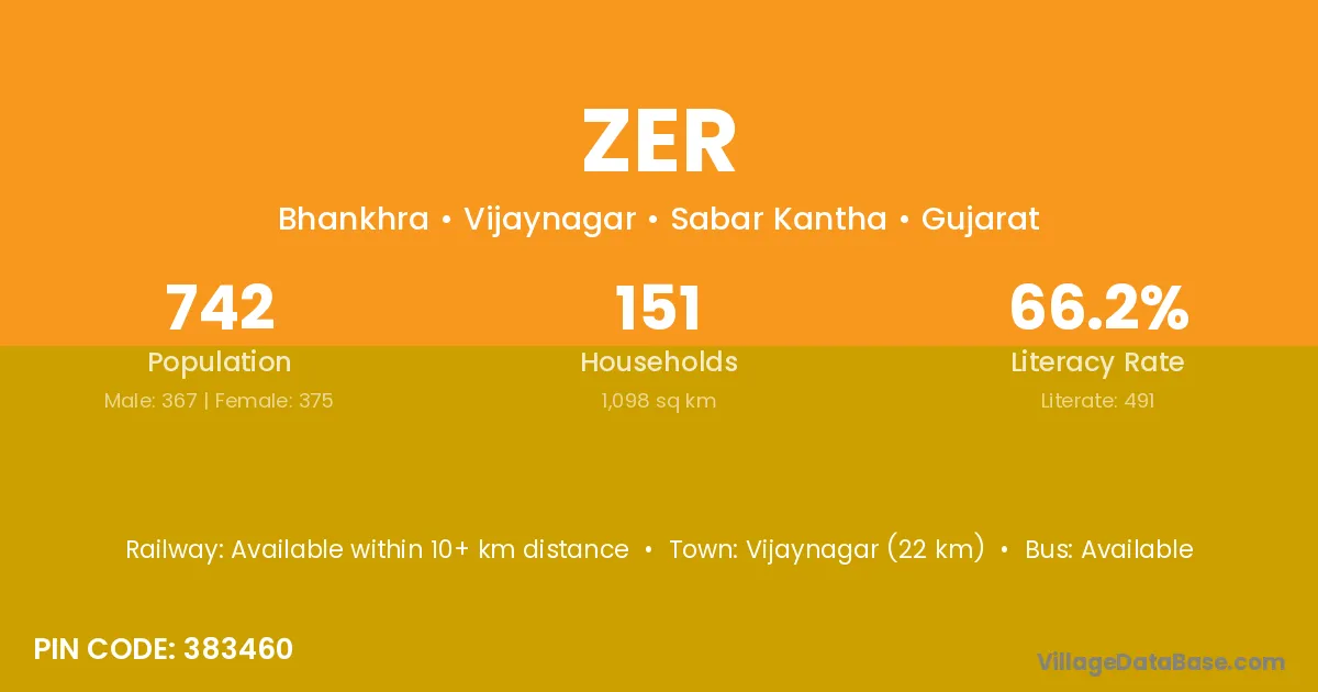 Kevadiya (21 km) is the nearest town to Zer village for major economic activities and is located approximately 21 km away.
