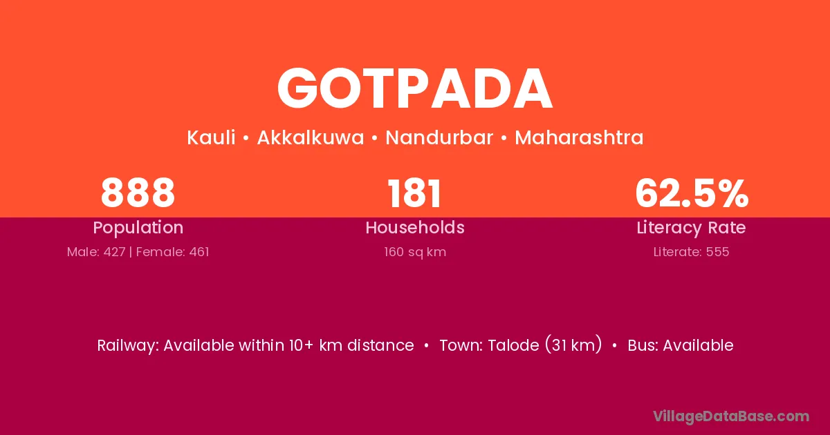Sagbara (3 km) is the nearest town to Gotpada village for major economic activities and is located approximately 3 km away.