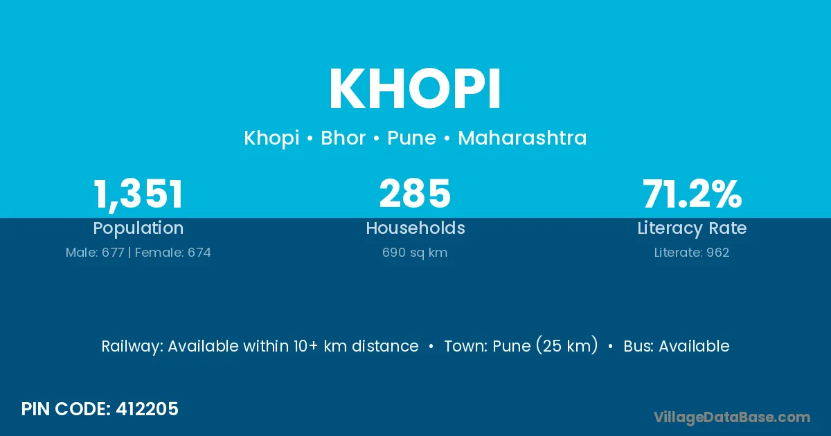 The literacy rate of Khopi village is 45.63%. Male literacy stands at 52.27% and female literacy at 39.24%.