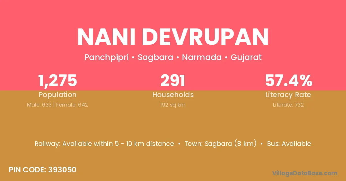 Sagbara (8 km) is the nearest town to Nani Devrupan village for major economic activities and is located approximately 8 km away.