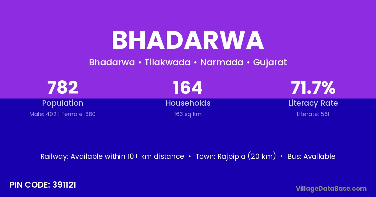 Rajpipla (20 km) is the nearest town to Bhadarwa village for major economic activities and is located approximately 20 km away.