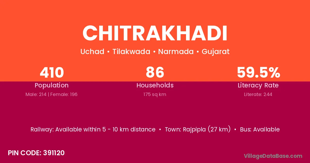 Rajpipla (27 km) is the nearest town to Chitrakhadi village for major economic activities and is located approximately 27 km away.